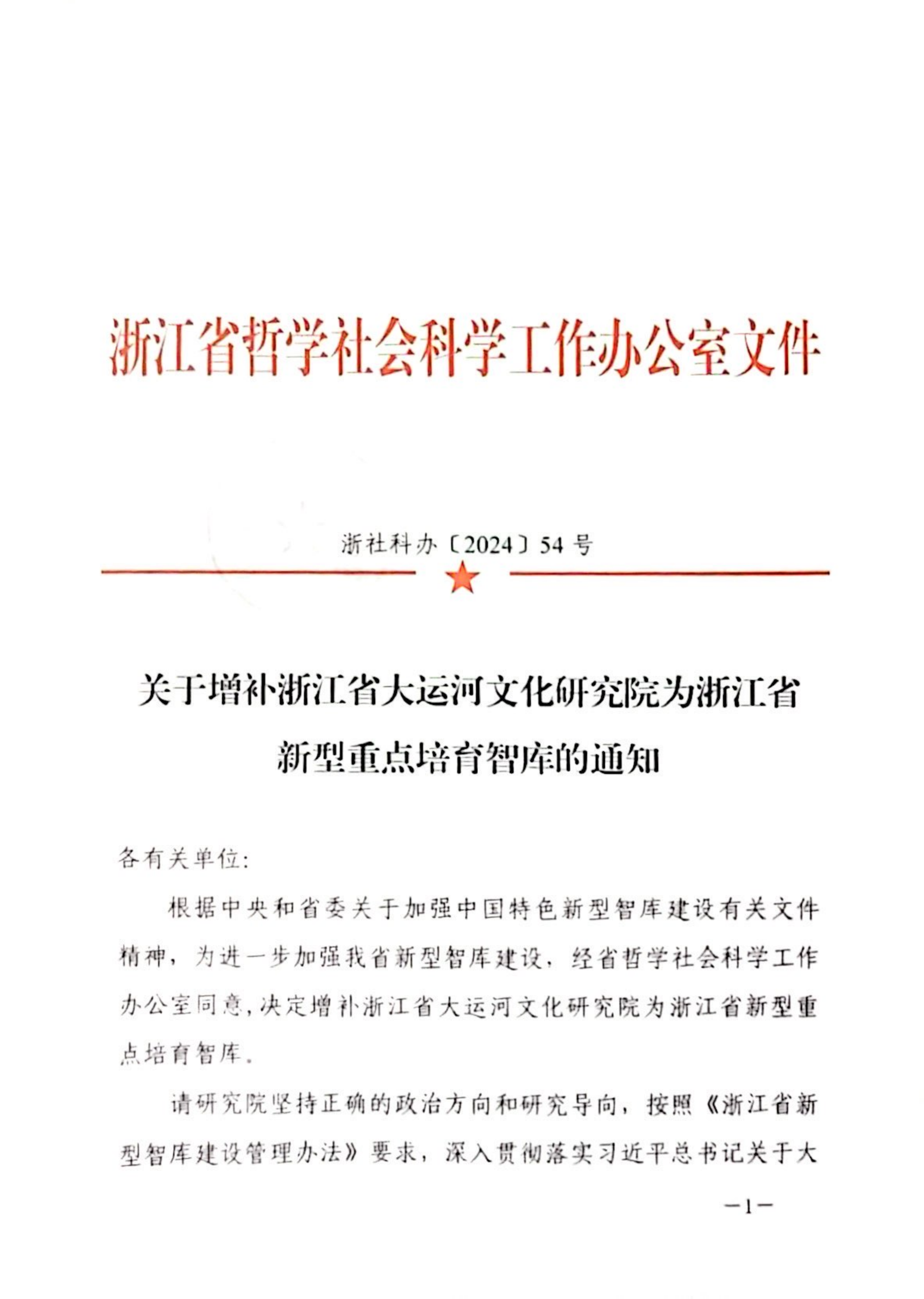 近日,浙江省哲学社会科学工作办公室发布了《关于增补浙江省大运河文化研究院为浙江省新型重点培育智库的通知》,“浙江省大运河文化研究院”获批重点培育智库,是学校首个省级哲社科新型智库。
