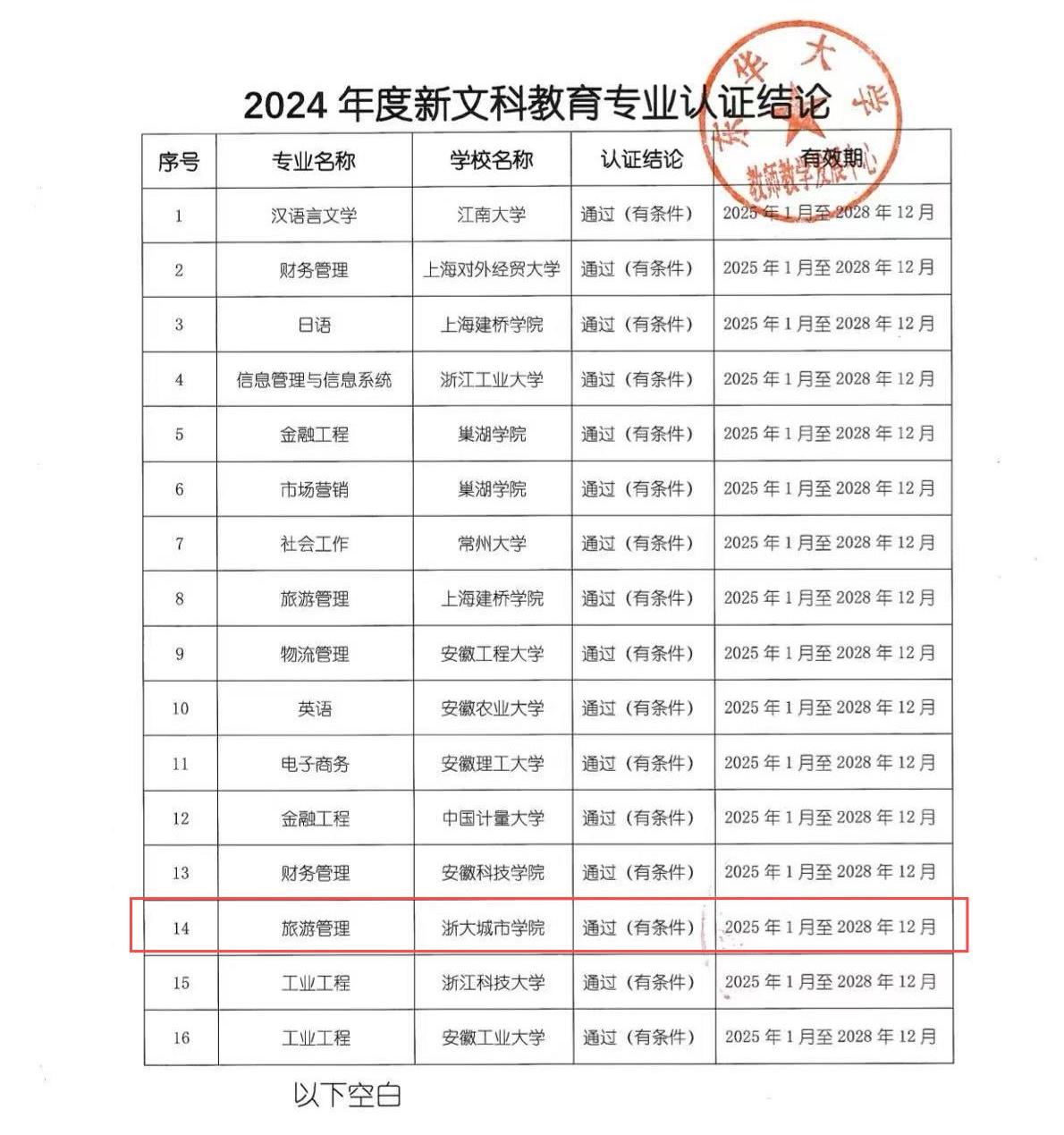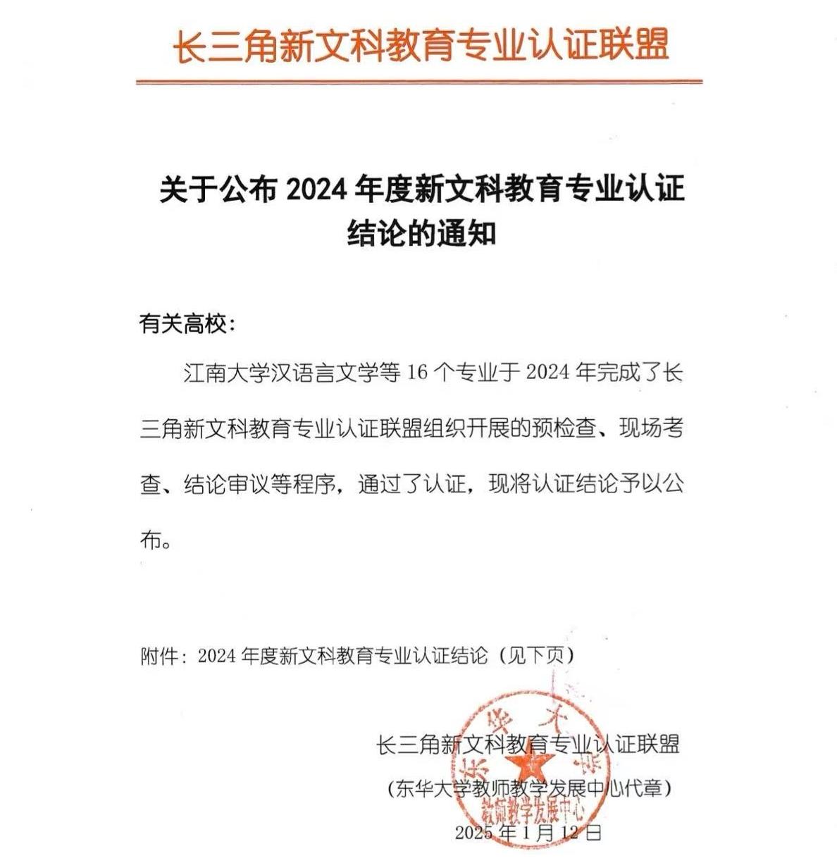 近日,长三角新文科教育专业认证联盟发布了《关于公布2024年度新文科教育专业认证结论的通知》。我校旅游管理专业通过认证,认证结论有效期为4年,即2025年1月至2028年12月。至此,我校共有2个专业通过新文科教育专业认证。