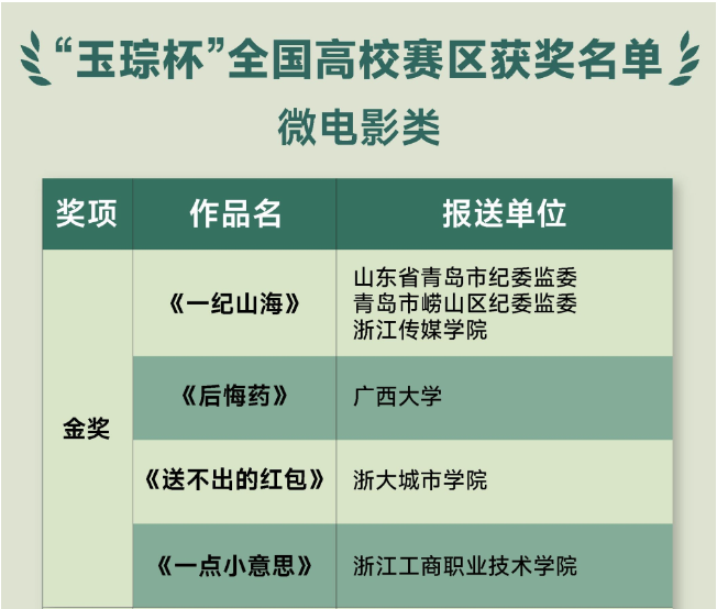 近日,第六届“玉琮杯”清廉微电影微视频大赛高校赛区获奖名单重磅揭晓,我校从全国128所高校和单位报送的724部作品中脱颖而出,斩获“玉琮杯”全国高校赛区微电影类金奖1项、铜奖1项,微视频类铜奖1项,学校被授予组织奖,在“玉琮杯”大赛中的成绩再创新高!